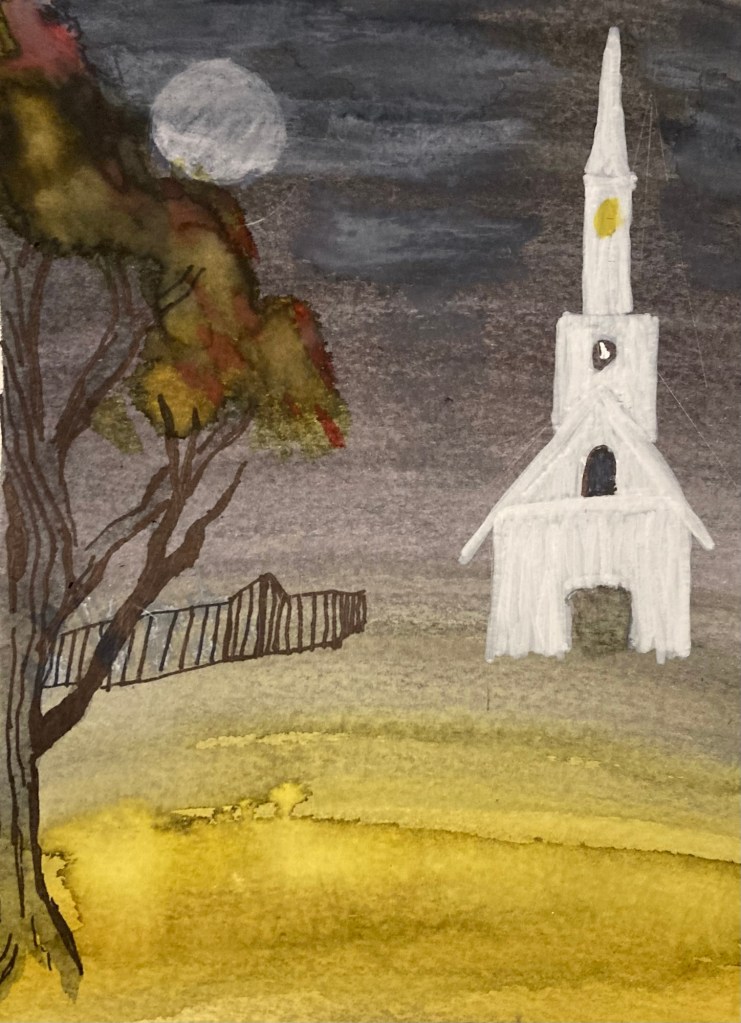 I think the white meetinghouse, which is iconic feature in New England landscape, will become a series of paintings. There is a lot I could do with it, just like the woods. Need to even out my proportions though.