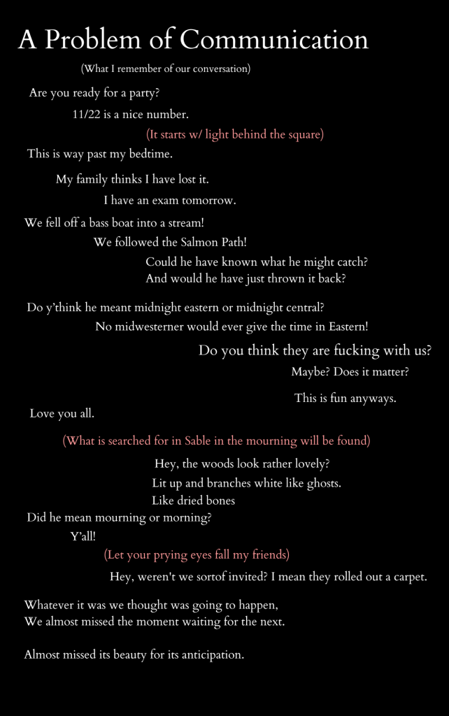 We had our friendly neighborhood impersonator telling us to all meet in the evening and maybe 10 or so of us did. (He must have known something, was on the inside? but people accused me of the same, shit people accused me of being Justin Vernon which is both horrifying and laughable, so maybe our impersonator was just some random dude having fun? ) And the lights went on, filmed in black and white IR, and lit up the woods in a beautiful way. And bc we were wondering what would happen we almost missed the moment.